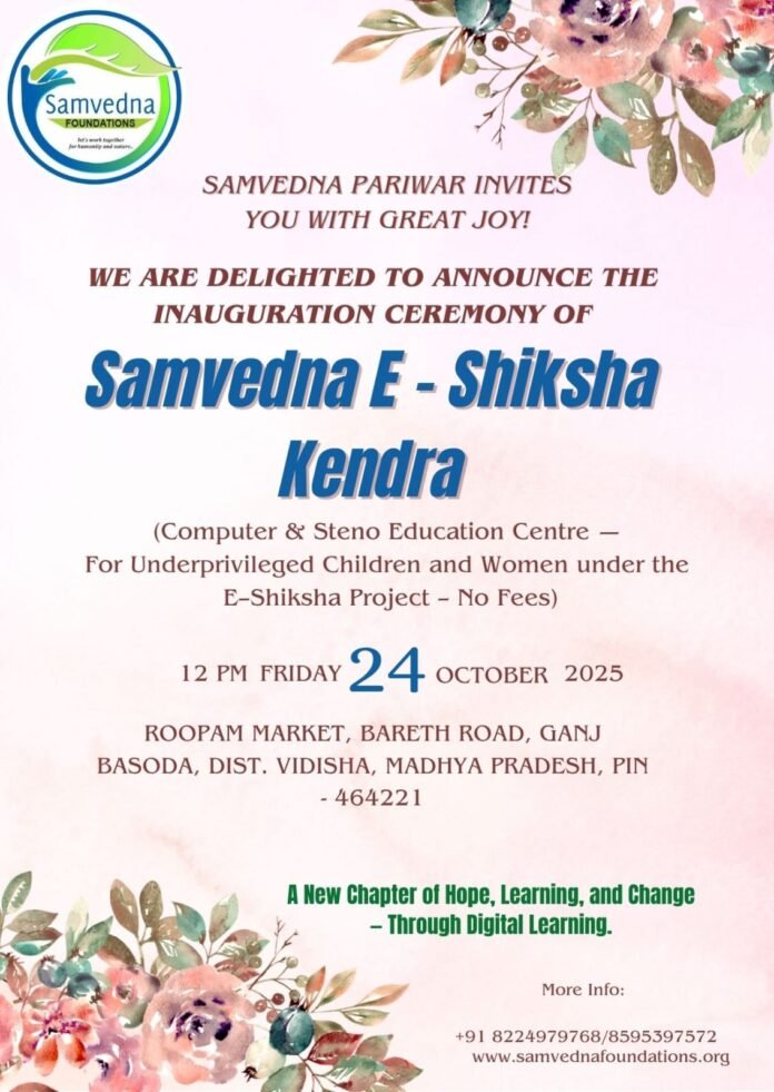 आज दिनांक 24.10.2025 दिन शुक्रवार को हमारे गंज बासौदा शहर में संवेदना फाउंडेशन्स के तत्वाधान में ई-शिक्षा केन्द्र का शुभारंभ कार्यक्रम नगर के विधायक महोदय श्री हरिसिंह जी रघुवंशी, श्री गोविंद जी पटेल, श्री किशन जी महाराज, श्री निरंजन सिंह जी रघुवंशी (पूर्व मार्केटिंग अध्यक्ष), श्री छोटेलाल जी रघुवंशी (ठेकेदार), श्री राजा जी रघुवंशी, श्री राहुल जी पलोड़ आदि गणमान्य की उपस्थिति में सम्पन्न हुआ। संवेदना फाउंडेशन्स की इस पहल में नगर के गरीब बच्चों एवं महिलाओं को निःशुल्क कम्प्यूटर शिक्षा एवं स्टेनोग्राफी की शिक्षा प्रदान की जावेगी एवं सर्टिफिकेट प्रदान किये जायेंगे।