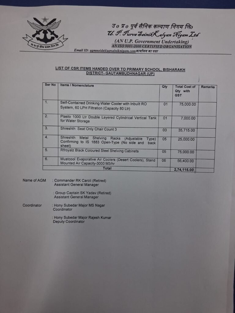 उत्तर प्रदेश पूर्व सैनिक कल्याण निगम लिमिटेड ने ग्रेटर नोएडा वेस्ट के प्राथमिक विद्यालय बिसरख को दिया 274000 का समान